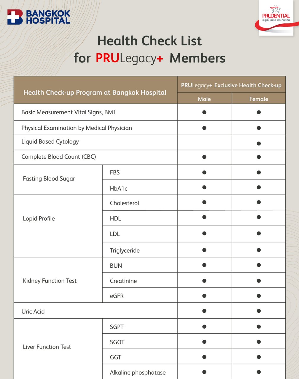Exclusive privileges for PRULegacy+ members, receive PRULegacy+ Exclusive Health Check-up at 22 Bangkok Hospital branches nationwide.