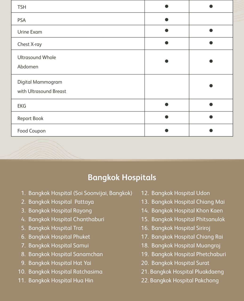 Bangkok Hospital Group that can use the services of 22 hospitals as follows: Bangkok Hospital (Soi Soonvijai, Bangkok), Bangkok Hospital Pattaya, Bangkok Hospital Rayong, Bangkok Hospital Chanthaburi, Bangkok Hospital Trat, Bangkok Hospital Phuket, Bangkok Hospital Samui, Bangkok Hospital Sanamchan, Bangkok Hospital Hat Yai, Bangkok Hospital Ratchasima, Bangkok Hospital Hua Hin, Bangkok Hospital Udon, Bangkok Hospital Chiang Mai, Bangkok Hospital Khon Kaen, Bangkok Hospital Phitsanulok, Bangkok Hospital Siriroj, Bangkok Hospital Chiang Rai, Bangkok Hospital Muangraj ,Bangkok Hospital Phetchaburi, Bangkok Hospital Surat, Bangkok Hospital Pluakdaeng and Bangkok Hospital Pakchong