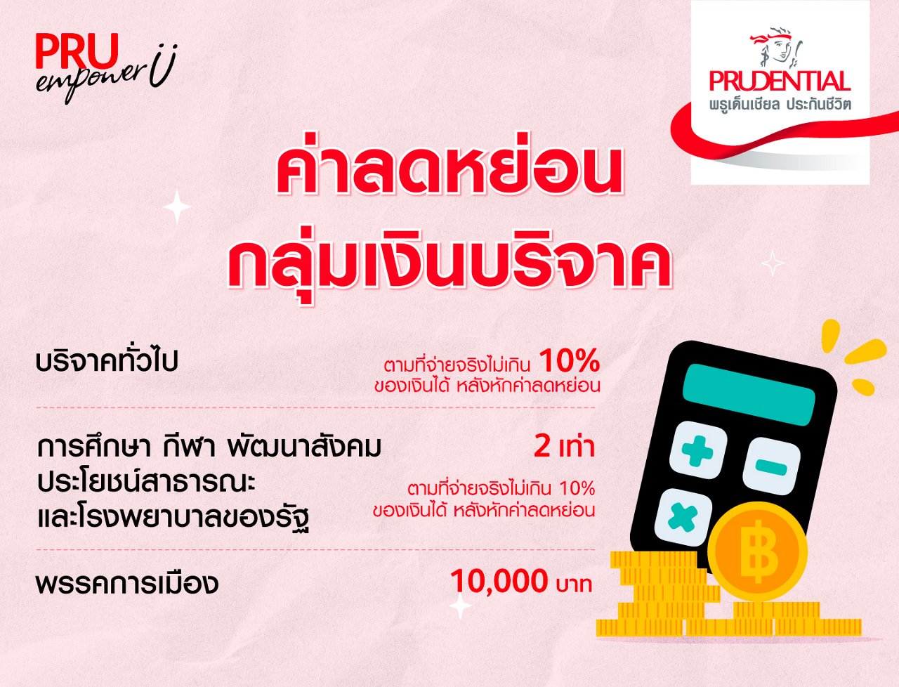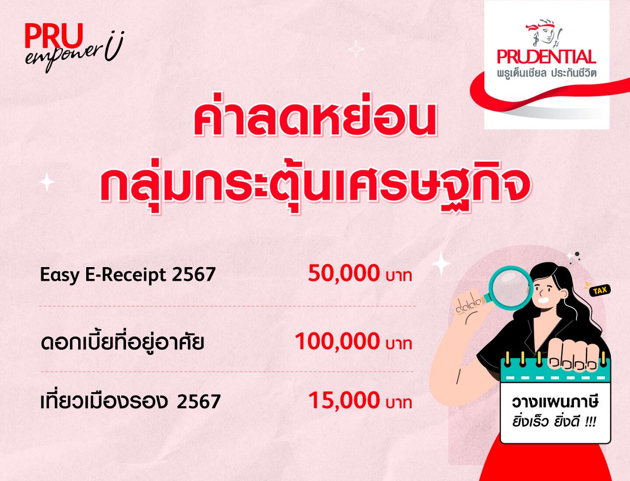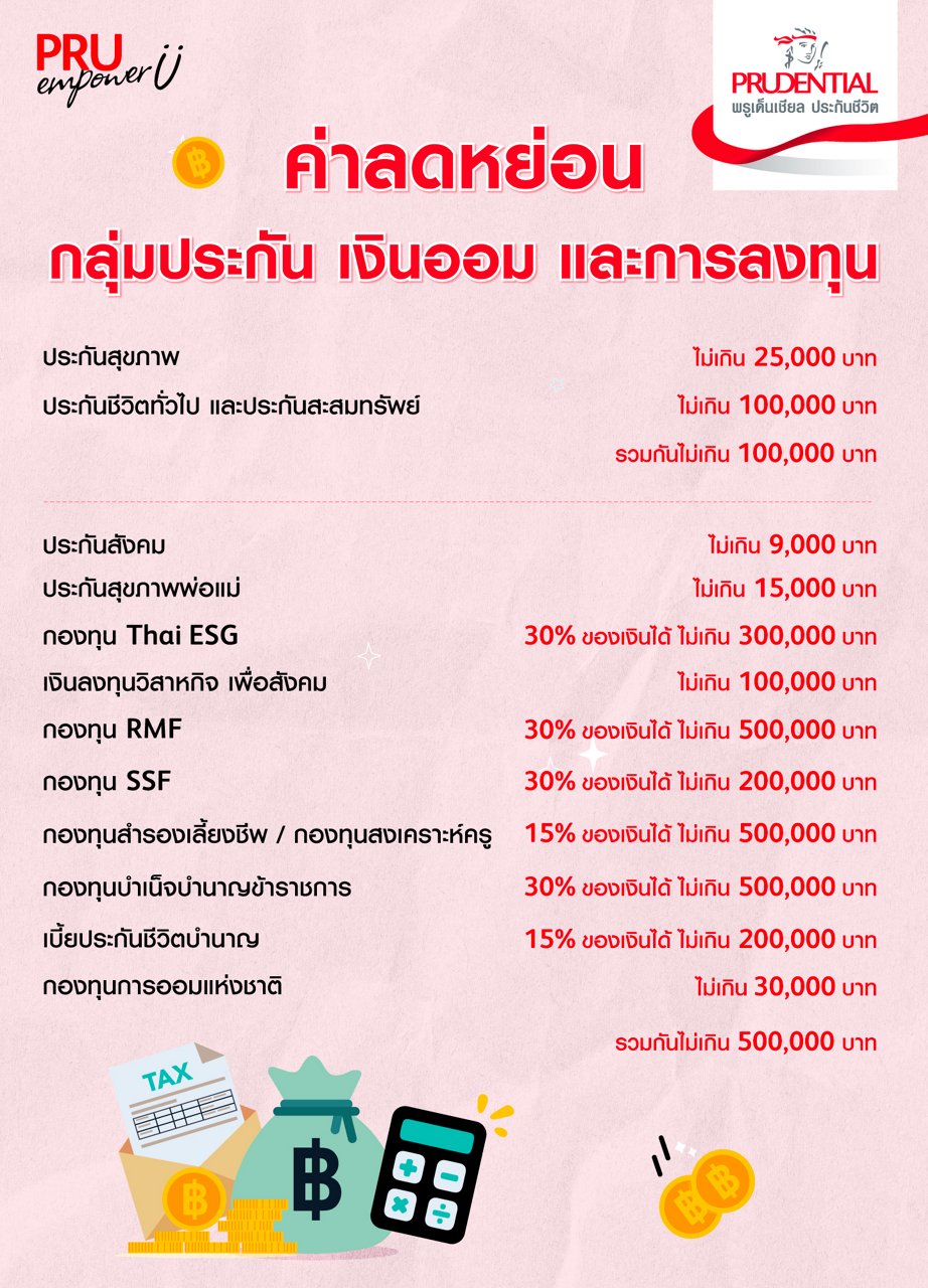 วางแผนลดหย่อนภาษีตั้งแต่วันนี้! ขอแนะนำประกันชีวิตและประกันสุขภาพ จากพรูเด็นเชียล ประกันชีวิต ที่มีให้เลือกหลากหลายแผนตามความต้องการ โดยให้ความคุ้มครองที่คุ้มค่า แต่ราคาค่าเบี้ยไม่แพง อีกทั้งยังสามารถนำมา ได้ตามที่กำหนด สนใจสามารถซื้อได้จากช่องทางตัวแทน และช่องทางออนไลน์