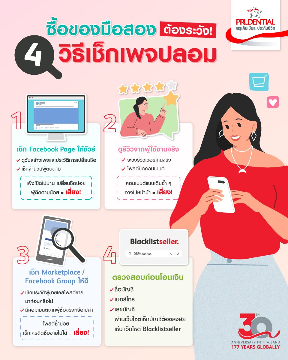 ก่อนจะซื้อของมือสองออนไลน์ อย่าลืมตรวจสอบให้แน่ใจว่าเพจหรือผู้ขายน่าเชื่อถือจริง! ไม่ว่าจะเป็นวันสร้างเพจ จำนวนผู้ติดตาม รีวิวจากผู้ใช้งาน หรือประวัติการโพสต์ขาย ทุกจุดล้วนเป็นสัญญาณที่ช่วยให้เรา รู้ทันภัยออนไลน์ และลดความเสี่ยงจากการโดนหลอกโอนเงินโดยมิจฉาชีพ