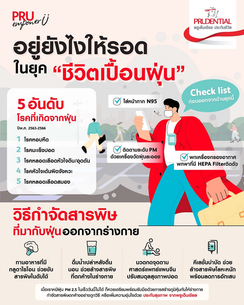 เมื่อเราหนีฝุ่น PM 2.5 ในเร็ววันนี้ไม่ได้ ก็ควรเตรียมพร้อมรับมือด้วยการสร้างภูมิคุ้มกันในร่างกาย กำจัดสารพิษตกค้างอย่างถูกวิธี หรือเพิ่มความอุ่นใจให้ตัวเองด้วยประกันสุขภาพ จากพรูเด็นเชียล ประกันชีวิต ไม่ต้องสำรองจ่ายเมื่อเข้ารับการรักษาในโรงพยาบาลในเครือข่ายกว่า 500 แห่ง ทั่วประเทศไทย คุ้มครองทุกช่วงวัย ไม่ว่าจะเด็ก ผู้สูงอายุ หรือวัยทำงาน สามารถเลือกประกันที่เหมาะกับความต้องการของคุณได้เลย