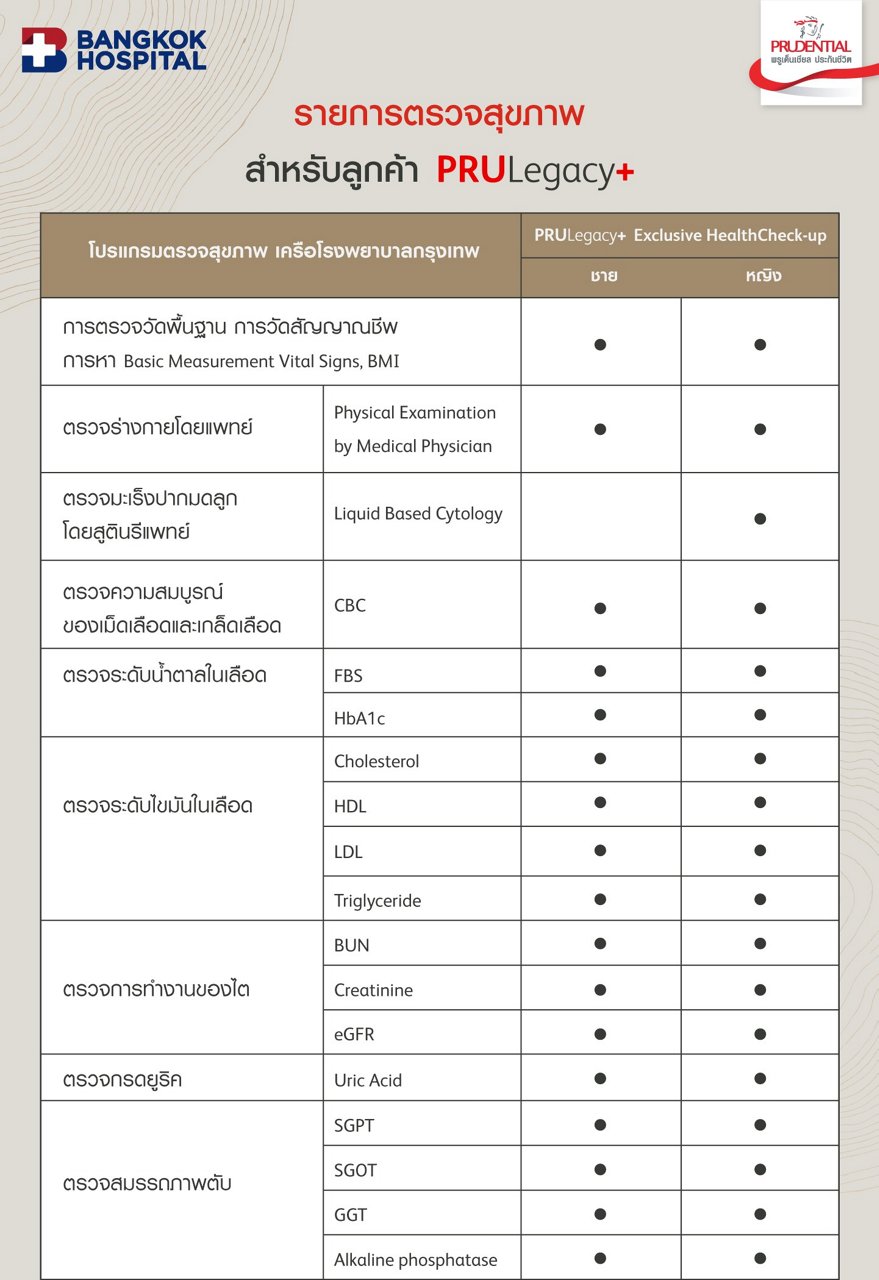- อภิสิทธิ์เฉพาะสมาชิก PRULegacy+ รับแพ็กเกจตรวจสุขภาพ PRULegacy+ Exclusive Health Check-up ที่โรงพยาบาลกรุงเทพ 22 สาขาทั่วประเทศ